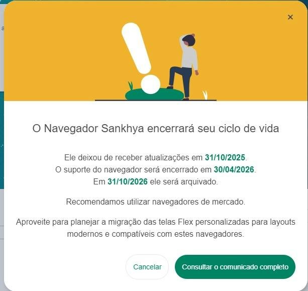 Solicitamos a todos os usuários que hoje utilizam o Navegador Sankhya específico que fiquem atentos às orientações do nosso setor de TI. Nas próximas semanas, iniciaremos o processo de verificação das estações de trabalho para garantir que todos tenham os navegadores padrão atualizados e acesso às novas interfaces web (Sankhya Om). Se você notar alguma funcionalidade ou tela personalizada que se comporta de maneira diferente, por favor, reporte imediatamente ao suporte interno para que possamos ajustar os layouts antes dos prazos finais.